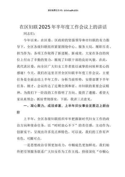 【七哥公文】2025年:【七哥公文】在区妇联2025年半年度工作会议上的讲话+更多免费公文+VX:QiGeGongWen2024+更多免费公文+VX:QiGeGongWen2024