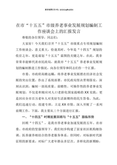 【七哥公文】2025年:【七哥公文】在市“十五五”市级养老事业发展规划编制工作座谈会上的汇报发言+更多免费公文+VX:QiGeGongWen2024+更多免费公文+VX:QiGeGongWen2024