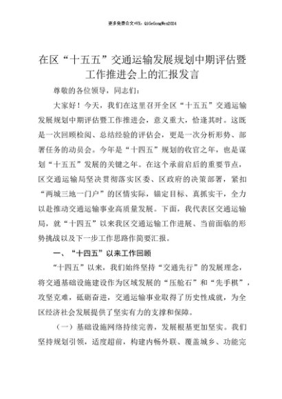 【七哥公文】2025年:【七哥公文】在区“十五五”交通运输发展规划中期评估暨工作推进会上的汇报发言+更多免费公文+VX:QiGeGongWen2024+更多免费公文+VX:QiGeGongWen2024