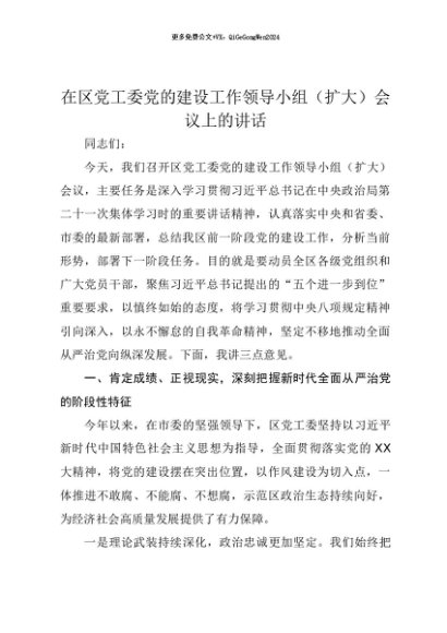 【七哥公文】2025年:【七哥公文】在区党工委党的建设工作领导小组(扩大)会议上的讲话+更多免费公文+VX:QiGeGongWen2024+更多免费公文+VX:QiGeGongWen2024