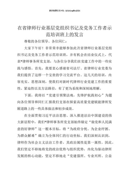 【七哥公文】2025年:【七哥公文】在省律师行业基层党组织书记及党务工作者示范培训班上的发言+更多免费公文+VX:QiGeGongWen2024+更多免费公文+VX:QiGeGongWen2024