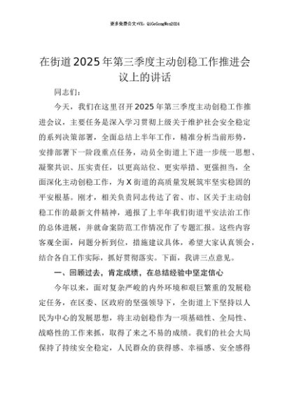 【七哥公文】2025年:【七哥公文】在街道2025年第三季度主动创稳工作推进会议上的讲话+更多免费公文+VX:QiGeGongWen2024+更多免费公文+VX:QiGeGongWen2024