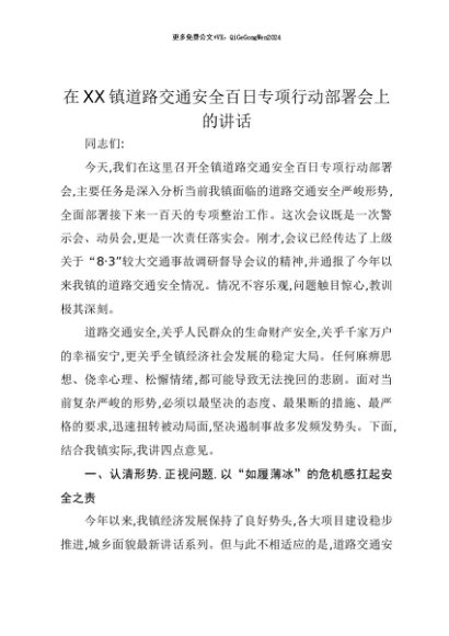 【七哥公文】2025年:【七哥公文】在XX镇道路交通安全百日专项行动部署会上的讲话+更多免费公文+VX:QiGeGongWen2024+更多免费公文+VX:QiGeGongWen2024