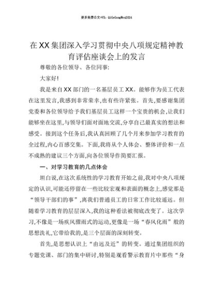 【七哥公文】2025年:【七哥公文】在XX集团深入学习贯彻中央八项规定精神教育评估座谈会上的发言+更多免费公文+VX:QiGeGongWen2024+更多免费公文+VX:QiGeGongWen2024