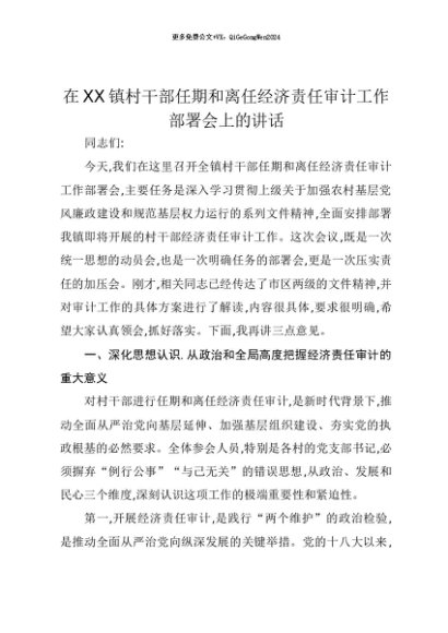 【七哥公文】2025年:【七哥公文】在XX镇村干部任期和离任经济责任审计工作部署会上的讲话+更多免费公文+VX:QiGeGongWen2024+更多免费公文+VX:QiGeGongWen2024