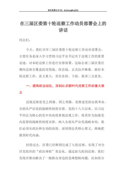 【七哥公文】2025年:【七哥公文】在三届区委第十轮巡察工作动员部署会上的讲话+更多免费公文+VX:QiGeGongWen2024+更多免费公文+VX:QiGeGongWen2024