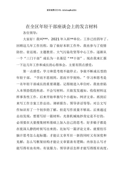 【七哥公文】2025年:【七哥公文】在全区年轻干部座谈会上的发言材料+更多免费公文+VX:QiGeGongWen2024+更多免费公文+VX:QiGeGongWen2024