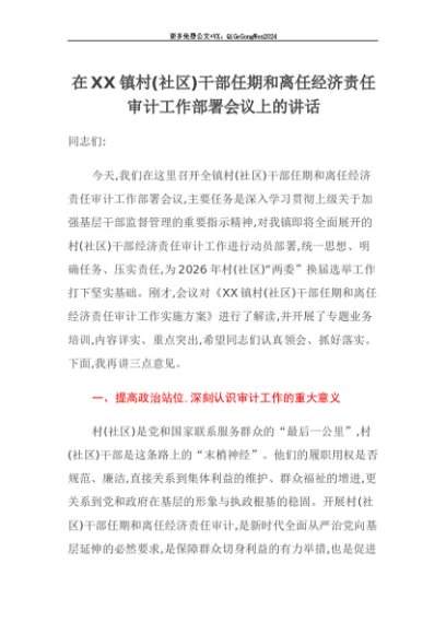 【七哥公文】2025年:【七哥公文】在XX镇村(社区)干部任期和离任经济责任审计工作部署会议上的讲话+更多免费公文+VX:QiGeGongWen2024+更多免费公文+VX:QiGeGongWen2024