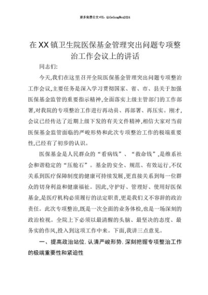 【七哥公文】2025年:【七哥公文】在XX镇卫生院医保基金管理突出问题专项整治工作会议上的讲话+更多免费公文+VX:QiGeGongWen2024+更多免费公文+VX:QiGeGongWen2024