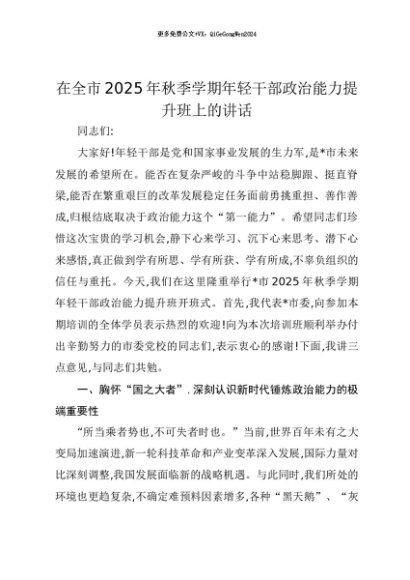【七哥公文】2025年:【七哥公文】在全市2025年秋季学期年轻干部政治能力提升班上的讲话+更多免费公文+VX:QiGeGongWen2024+更多免费公文+VX:QiGeGongWen2024