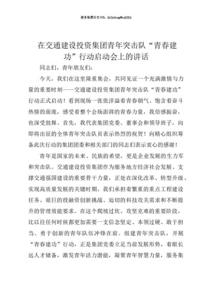 【七哥公文】2025年:【七哥公文】在交通建设投资集团青年突击队“青春建功”行动启动会上的讲话+更多免费公文+VX:QiGeGongWen2024+更多免费公文+VX:QiGeGongWen2024