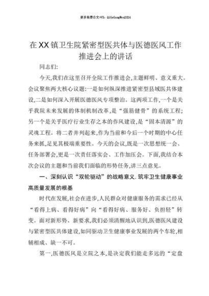 【七哥公文】2025年:【七哥公文】在XX镇卫生院紧密型医共体与医德医风工作推进会上的讲话+更多免费公文+VX:QiGeGongWen2024+更多免费公文+VX:QiGeGongWen2024