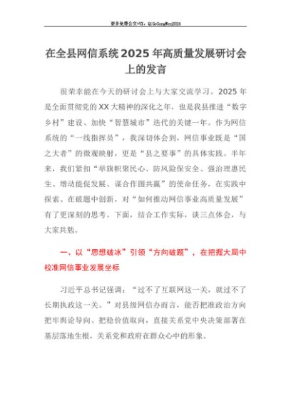 【七哥公文】2025年:【七哥公文】在全县网信系统2025年高质量发展研讨会上的发言+更多免费公文+VX:QiGeGongWen2024+更多免费公文+VX:QiGeGongWen2024
