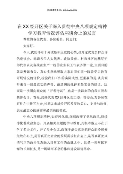 【七哥公文】2025年:【七哥公文】在XX经开区关于深入贯彻中央八项规定精神学习教育情况评估座谈会上的发言+更多免费公文+VX:QiGeGongWen2024+更多免费公文+VX:QiGeGongWen2024