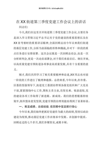 【七哥公文】2025年:【七哥公文】在XX街道第三季度党建工作会议上的讲话+更多免费公文+VX:QiGeGongWen2024+更多免费公文+VX:QiGeGongWen2024