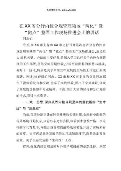 【七哥公文】2025年:【七哥公文】在XX省分行内控合规管理领域“两化”暨“靶点”整固工作现场推进会上的讲话+更多免费公文+VX:QiGeGongWen2024+更多免费公文+VX:QiGeGongWen2024