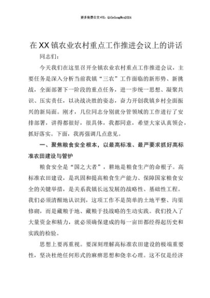 【七哥公文】2025年:【七哥公文】在XX镇农业农村重点工作推进会议上的讲话+更多免费公文+VX:QiGeGongWen2024+更多免费公文+VX:QiGeGongWen2024