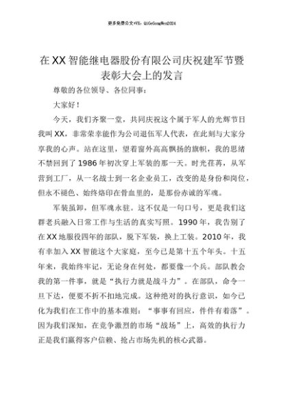 【七哥公文】2025年:【七哥公文】在XX智能继电器股份有限公司庆祝建军节暨表彰大会上的发言+更多免费公文+VX:QiGeGongWen2024+更多免费公文+VX:QiGeGongWen2024