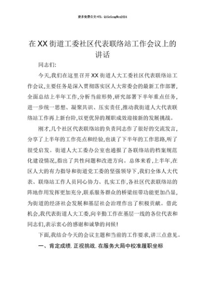 【七哥公文】2025年:【七哥公文】在XX街道工委社区代表联络站工作会议上的讲话+更多免费公文+VX:QiGeGongWen2024+更多免费公文+VX:QiGeGongWen2024
