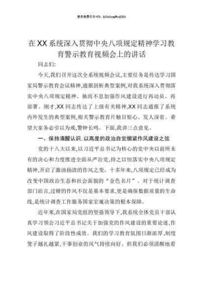 【七哥公文】2025年:【七哥公文】在XX系统深入贯彻中央八项规定精神学习教育警示教育视频会上的讲话+更多免费公文+VX:QiGeGongWen2024+更多免费公文+VX:QiGeGongWen2024