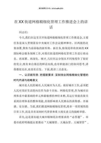 【七哥公文】2025年:【七哥公文】在XX街道网格精细化管理工作推进会上的讲话+更多免费公文+VX:QiGeGongWen2024+更多免费公文+VX:QiGeGongWen2024