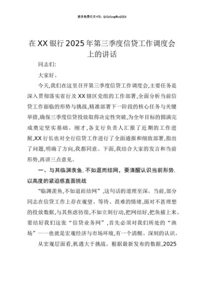 【七哥公文】2025年:【七哥公文】在XX银行2025年第三季度信贷工作调度会上的讲话+更多免费公文+VX:QiGeGongWen2024+更多免费公文+VX:QiGeGongWen2024