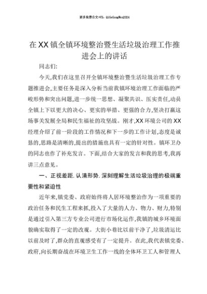 【七哥公文】2025年:【七哥公文】在XX镇全镇环境整治暨生活垃圾治理工作推进会上的讲话+更多免费公文+VX:QiGeGongWen2024+更多免费公文+VX:QiGeGongWen2024