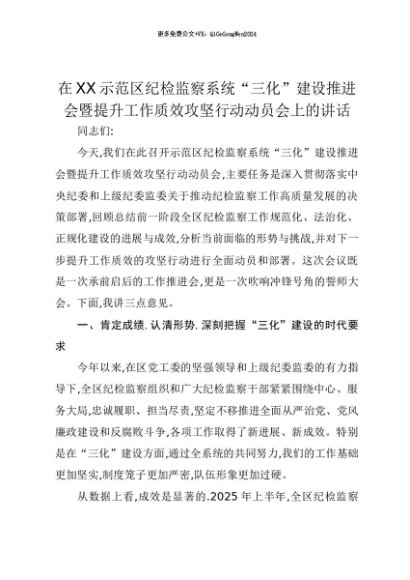 【七哥公文】2025年:【七哥公文】在XX示范区纪检监察系统“三化”建设推进会暨提升工作质效攻坚行动动员会上的讲话+更多免费公文+VX:QiGeGongWen2024+更多免费公文+VX:QiGeGongWen2024