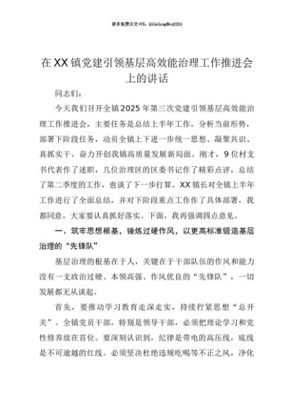 【七哥公文】2025年:【七哥公文】在XX镇党建引领基层高效能治理工作推进会上的讲话+更多免费公文+VX:QiGeGongWen2024+更多免费公文+VX:QiGeGongWen2024