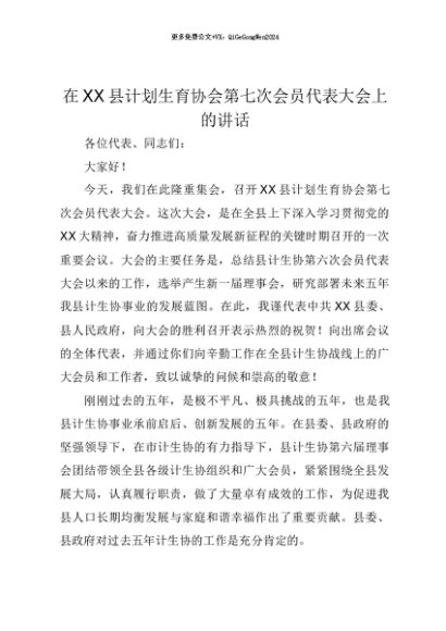 【七哥公文】2025年:【七哥公文】在XX县计划生育协会第七次会员代表大会上的讲话+更多免费公文+VX:QiGeGongWen2024+更多免费公文+VX:QiGeGongWen2024