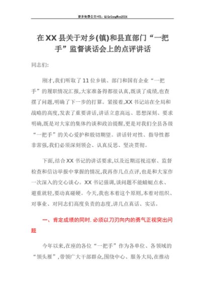 【七哥公文】2025年:【七哥公文】在XX县关于对乡(镇)和县直部门“一把手”监督谈话会上的点评讲话+更多免费公文+VX:QiGeGongWen2024+更多免费公文+VX:QiGeGongWen2024