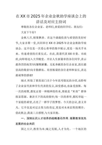 【七哥公文】2025年:【七哥公文】在XX市2025年企业金秋助学座谈会上的讲话及对应主持词+更多免费公文+VX:QiGeGongWen2024+更多免费公文+VX:QiGeGongWen2024