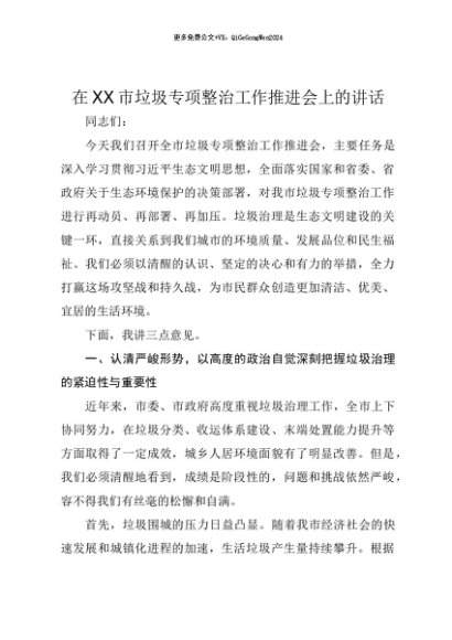 【七哥公文】2025年:【七哥公文】在XX市垃圾专项整治工作推进会上的讲话+更多免费公文+VX:QiGeGongWen2024+更多免费公文+VX:QiGeGongWen2024