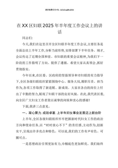 【七哥公文】2025年:【七哥公文】在XX区妇联2025年半年度工作会议上的讲话+更多免费公文+VX:QiGeGongWen2024+更多免费公文+VX:QiGeGongWen2024