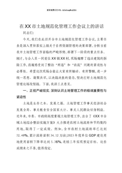 【七哥公文】2025年:【七哥公文】在XX市土地规范化管理工作会议上的讲话+更多免费公文+VX:QiGeGongWen2024+更多免费公文+VX:QiGeGongWen2024