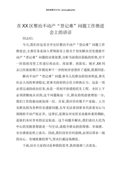 【七哥公文】2025年:【七哥公文】在XX区整治不动产“登记难”问题工作推进会上的讲话+更多免费公文+VX:QiGeGongWen2024+更多免费公文+VX:QiGeGongWen2024