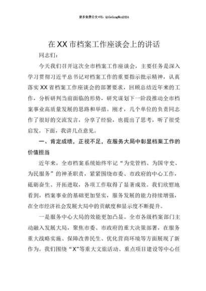 【七哥公文】2025年:【七哥公文】在XX市档案工作座谈会上的讲话+更多免费公文+VX:QiGeGongWen2024+更多免费公文+VX:QiGeGongWen2024