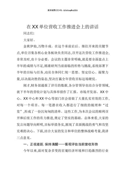 【七哥公文】2025年:【七哥公文】在XX单位营收工作推进会上的讲话+更多免费公文+VX:QiGeGongWen2024+更多免费公文+VX:QiGeGongWen2024