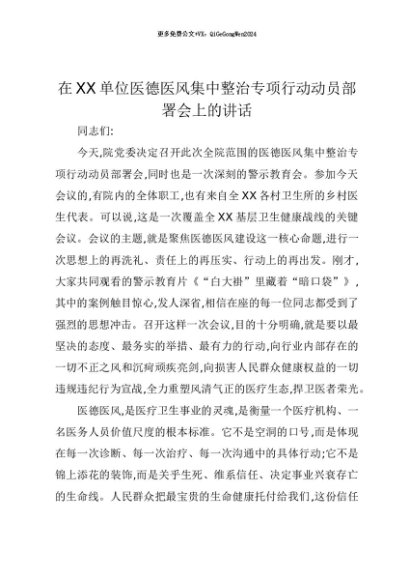 【七哥公文】2025年:【七哥公文】在XX单位医德医风集中整治专项行动动员部署会上的讲话+更多免费公文+VX:QiGeGongWen2024+更多免费公文+VX:QiGeGongWen2024