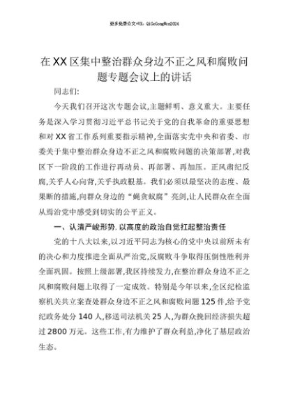 【七哥公文】2025年:【七哥公文】在XX区集中整治群众身边不正之风和腐败问题专题会议上的讲话+更多免费公文+VX:QiGeGongWen2024+更多免费公文+VX:QiGeGongWen2024