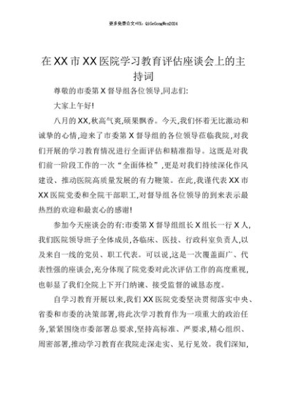 【七哥公文】2025年:【七哥公文】在XX市XX医院中央八项规定精神学习教育评估座谈会上的主持词+更多免费公文+VX:QiGeGongWen2024+更多免费公文+VX:QiGeGongWen2024