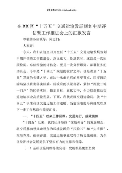 【七哥公文】2025年:【七哥公文】在XX区“十五五”交通运输发展规划中期评估暨工作推进会上的汇报发言+更多免费公文+VX:QiGeGongWen2024+更多免费公文+VX:QiGeGongWen2024