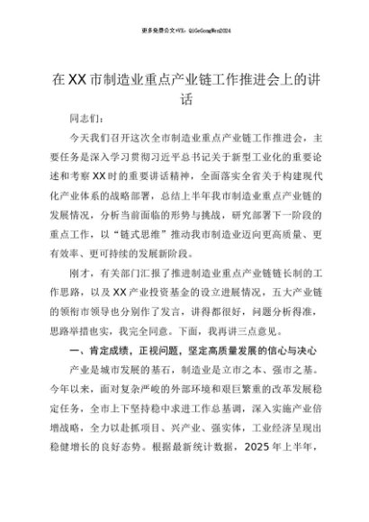 【七哥公文】2025年:【七哥公文】在XX市制造业重点产业链工作推进会上的讲话+更多免费公文+VX:QiGeGongWen2024+更多免费公文+VX:QiGeGongWen2024