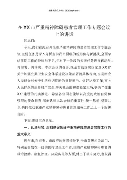 【七哥公文】2025年:【七哥公文】在XX市严重精神障碍患者管理工作专题会议上的讲话+更多免费公文+VX:QiGeGongWen2024+更多免费公文+VX:QiGeGongWen2024