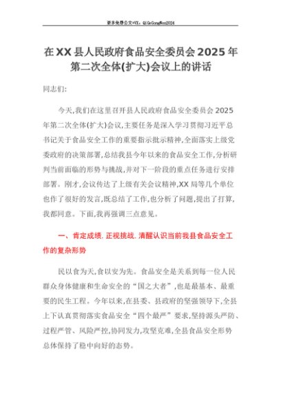 【七哥公文】2025年:【七哥公文】在XX县人民政府食品安全委员会2025年第二次全体(扩大)会议上的讲话+更多免费公文+VX:QiGeGongWen2024+更多免费公文+VX:QiGeGongWen2024