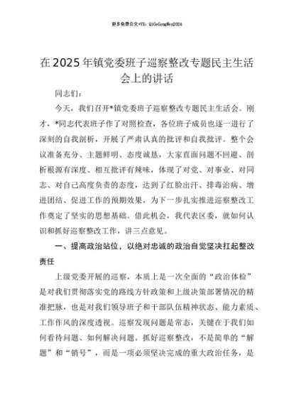 【七哥公文】2025年:【七哥公文】在2025年镇党委班子巡察整改专题民主生活会上的讲话+更多免费公文+VX:QiGeGongWen2024+更多免费公文+VX:QiGeGongWen2024