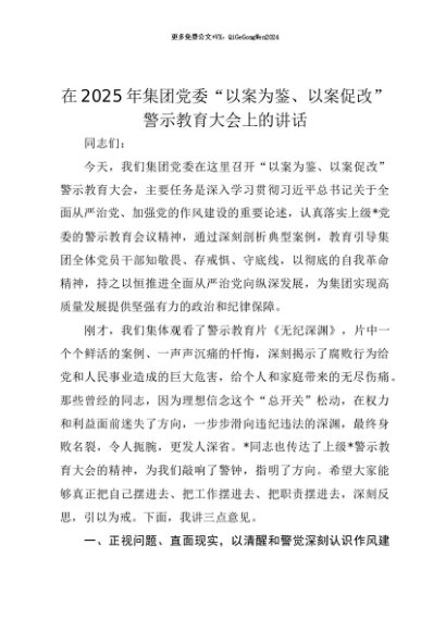 【七哥公文】2025年:【七哥公文】在2025年集团党委“以案为鉴、以案促改”警示教育大会上的讲话+更多免费公文+VX:QiGeGongWen2024+更多免费公文+VX:QiGeGongWen2024