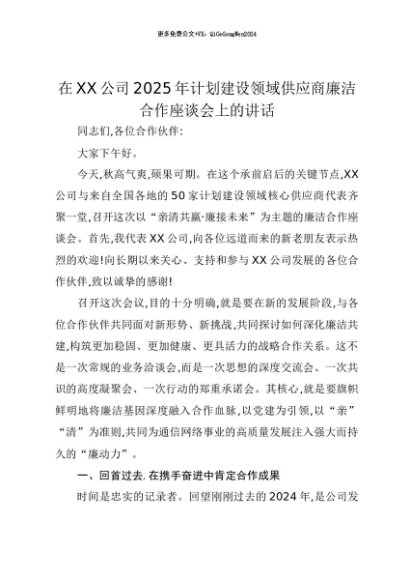 【七哥公文】2025年:【七哥公文】在XX公司2025年计划建设领域供应商廉洁合作座谈会上的讲话+更多免费公文+VX:QiGeGongWen2024+更多免费公文+VX:QiGeGongWen2024