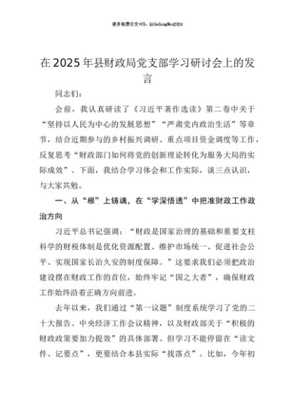 【七哥公文】2025年:【七哥公文】在2025年县财政局党支部学习研讨会上的发言+更多免费公文+VX:QiGeGongWen2024+更多免费公文+VX:QiGeGongWen2024