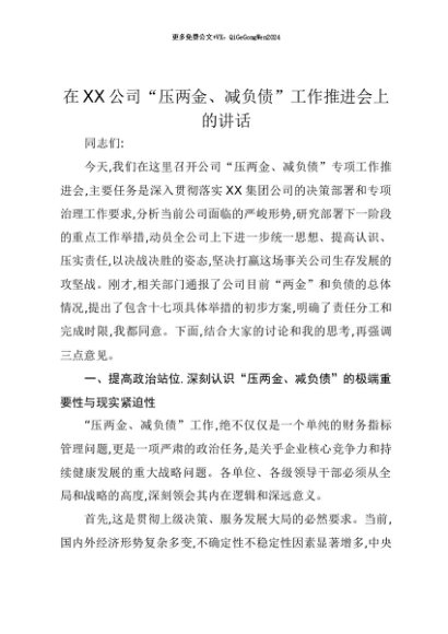 【七哥公文】2025年:【七哥公文】在XX公司“压两金、减负债”工作推进会上的讲话+更多免费公文+VX:QiGeGongWen2024+更多免费公文+VX:QiGeGongWen2024